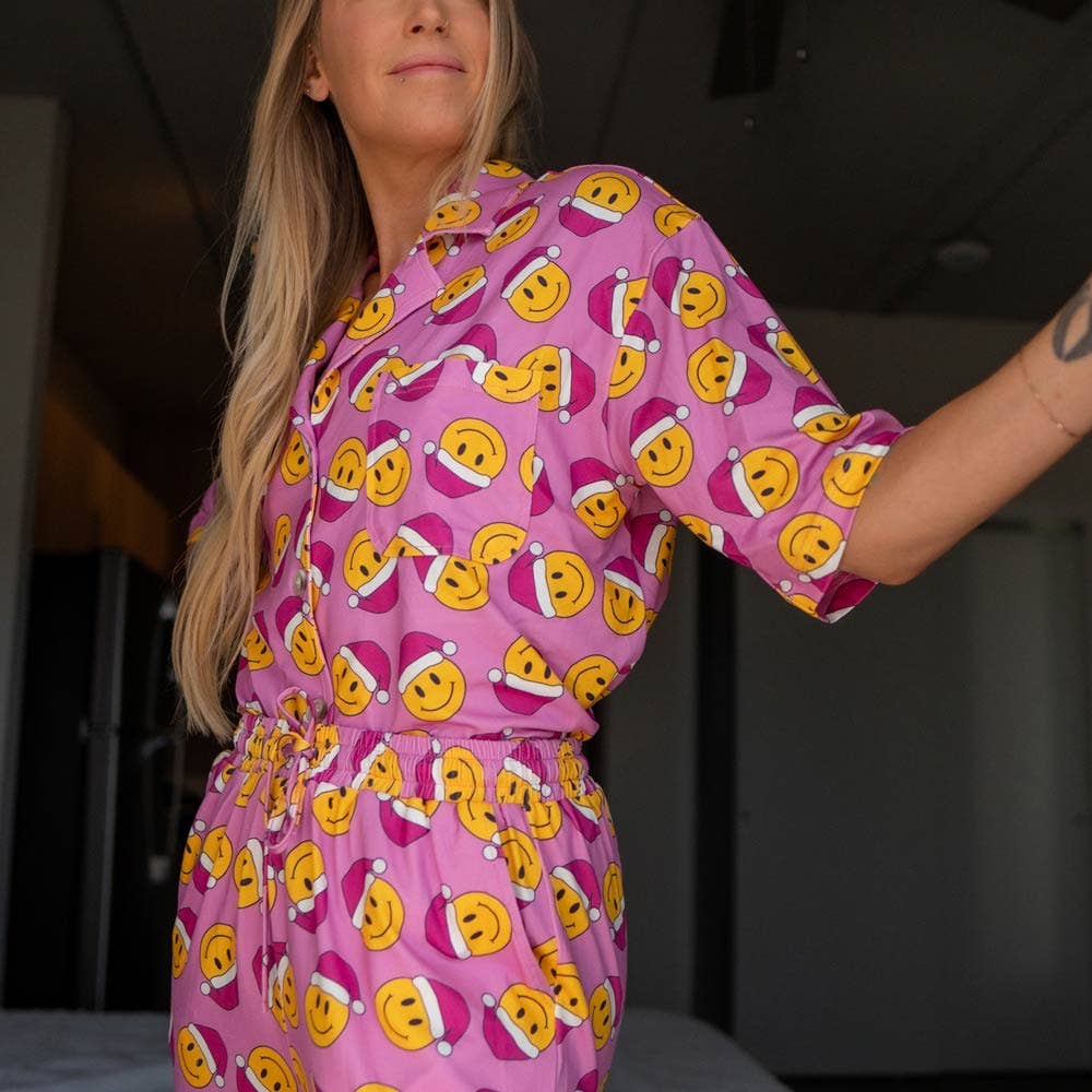 Get ready to spread some holiday cheer with our Happy Face Santa Hats Repeat Loungewear Set! This delightful two-piece ensemble features a short sleeve top and coordinating pants, perfect for lounging around in festive style. Crafted from soft and cozy fabric, this set is designed for ultimate comfort during the holiday season. The playful design showcases yellow smiley faces adorned with Santa hats, adding a fun and cheerful touch to the pink background.