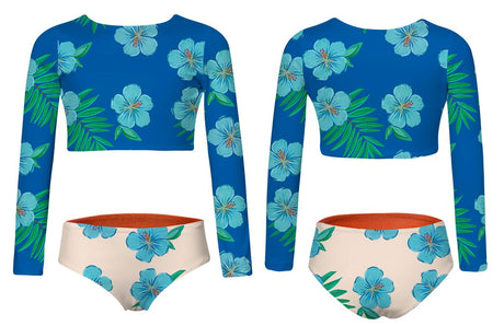 Bikini with longsleeve top and reversible bottoms. The fabric has UPF50+ protection factor which means that it acts as a protective shield against the sun's UV rays. Made in Colombia.