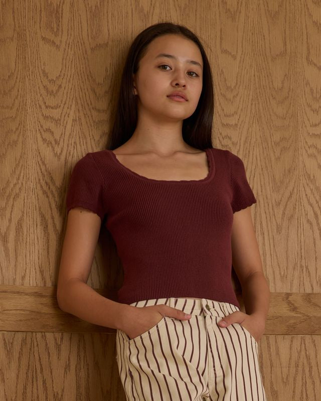 Our cropped-fit Scalloped Tee is a versatile fall staple, crafted from delicate pointelle knit fabric and detailed with scalloped sleeves and neckline.