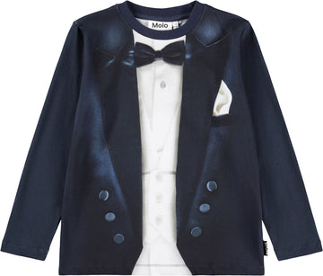 Dark blue long-sleeved top made of soft organic cotton with long sleeves and a ribbed neckline. The long-sleeved top has a loose fit with an illusion print of a tuxedo.