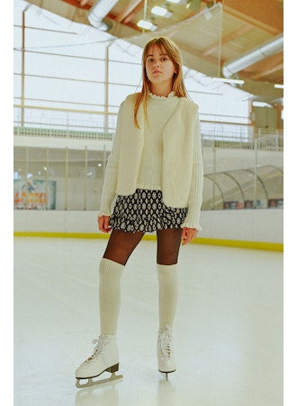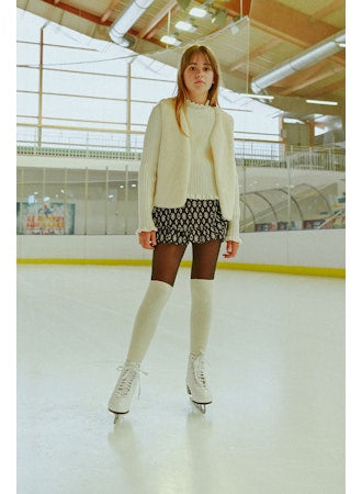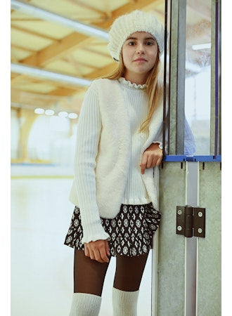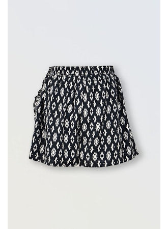 These shorts have a faux wrap skirt front for a skirt look with the convenience of shorts. The self fabric ruffle adds a feminine twist to these shorts. Elastic Waist.