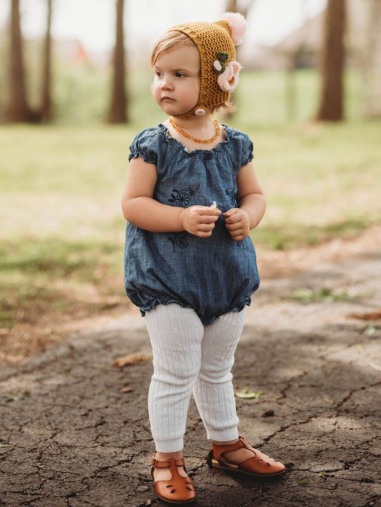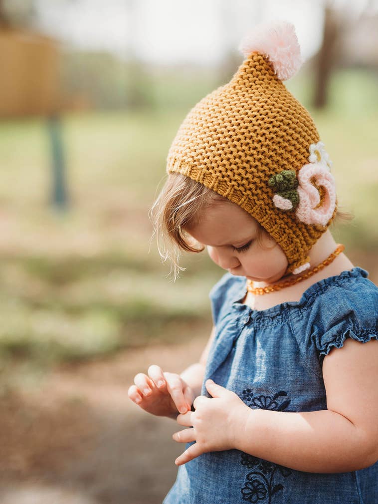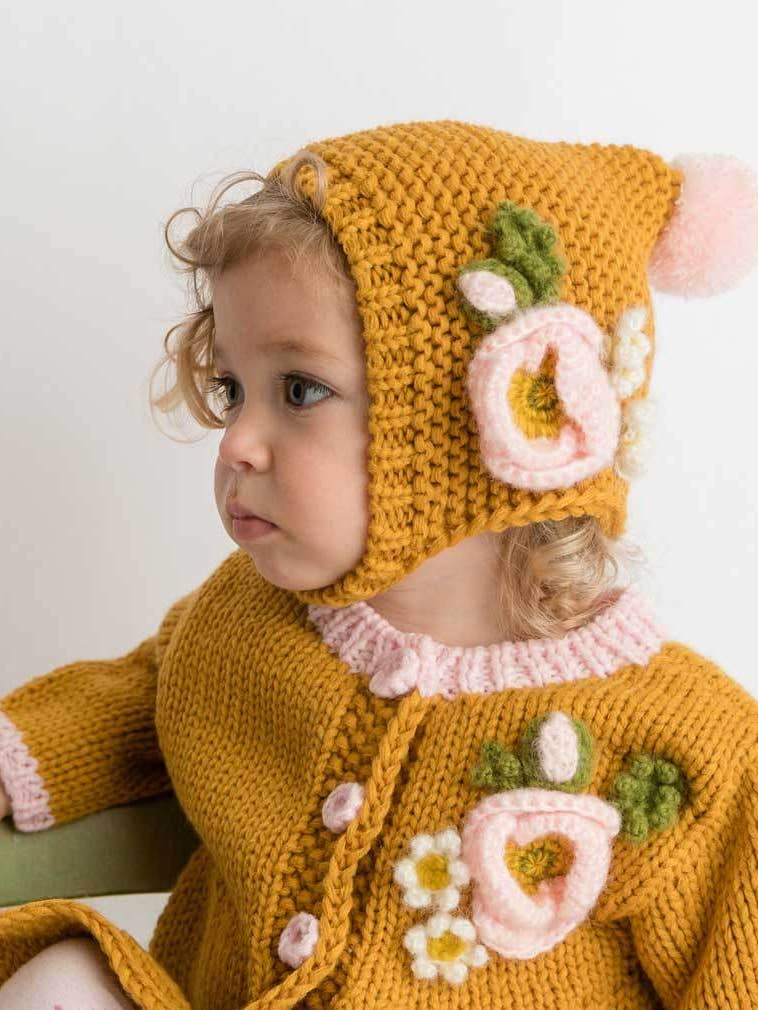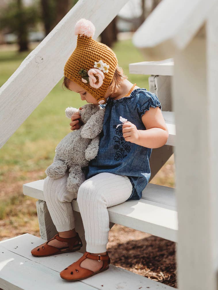 Just the prettiest bonnet in garter stitch knit with a gorgeous pink mohair poppy blossom appliqued on the side. Finished with a pink pom pom and pink yarn button closure for the strap.