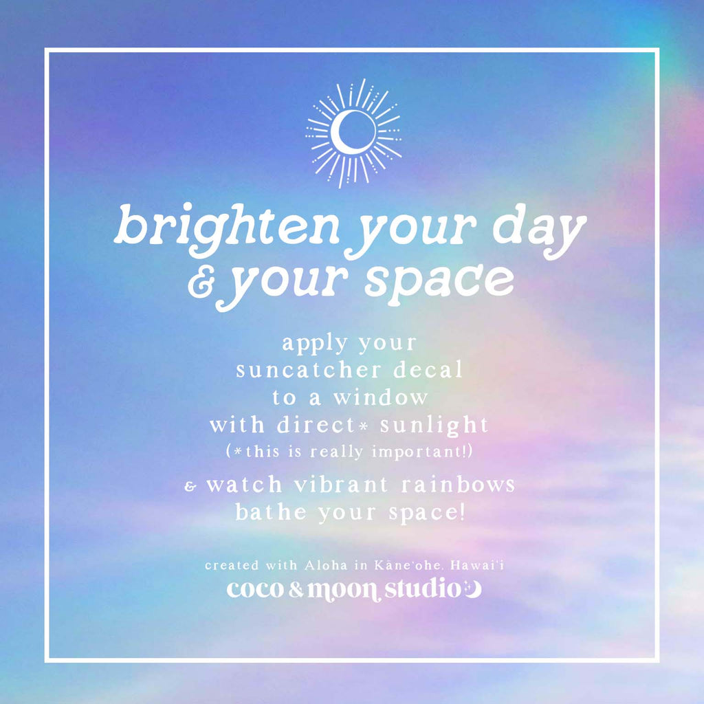 NEW! You are Made of Magic Suncatcher Sticker Rainbow Maker Window Decal, Sun & Moon Sun catcher ☀ Get lost in a daydream of rainbow magic with our new celestial-inspired suncatcher collection ☀🌈 This one is printed in color on super cool vinyl sun catcher film. Intended for application on windows that get direct sunlight. Directions (printed on the backs of the retail cards): Apply your new suncatcher decal to a window with * direct * sunlight (this is really important!) & watch bursts of vibrant rainbows bathe your space! Suncatcher Window Decal Size: this sticker is 4" x 4" All stickers & stationery products ship from our art studio in Hawaii.
