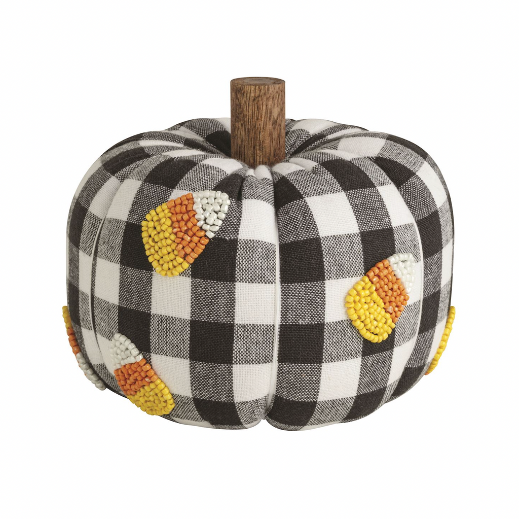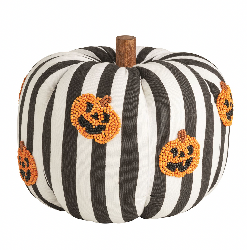 Plush cotton pumpkin with beaded icons and mango wood stem. Choose your favorite!