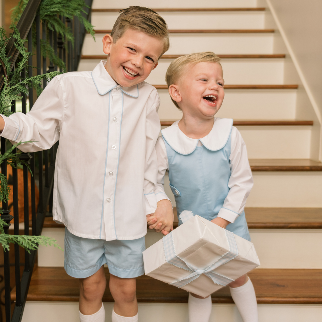 A Lullaby Set fan favorite sibley shirt. A white woven long sleeve blouse with a white peter pan collar piped in blue.