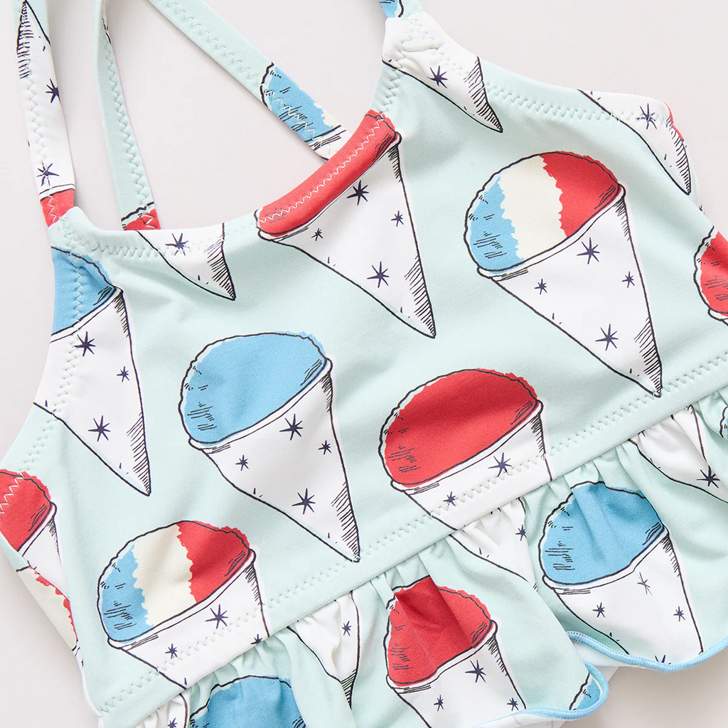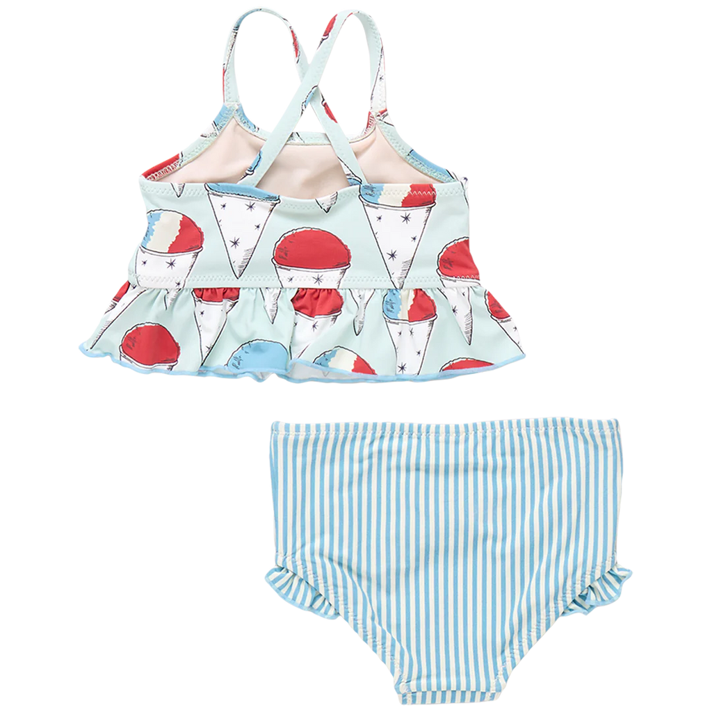 Summer Splash! Cool off in our Girls Joy Tankini crafted in our mouthwatering red, white and blue Snow Cones print. A generous ruffle hem and criss-cross shoulder straps define the charming top and a flirty ruffle at the leg of the coordinating blue and white striped bottom adds a fun touch. You'll want to chase the ice cream truck down the street in this refreshing duo. Now crafted in a new 50+ SPF material.
