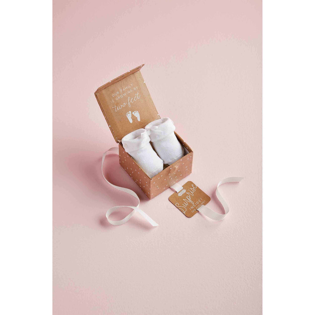 - Share new baby news with our Baby Sock Announcement Box. The box holds tiny cotton hosiery socks in a presentation gift box. The box features a tag that reads "Surprise inside! No peeking". The inside of the box features the sentiment "Our family is growing by two feet".