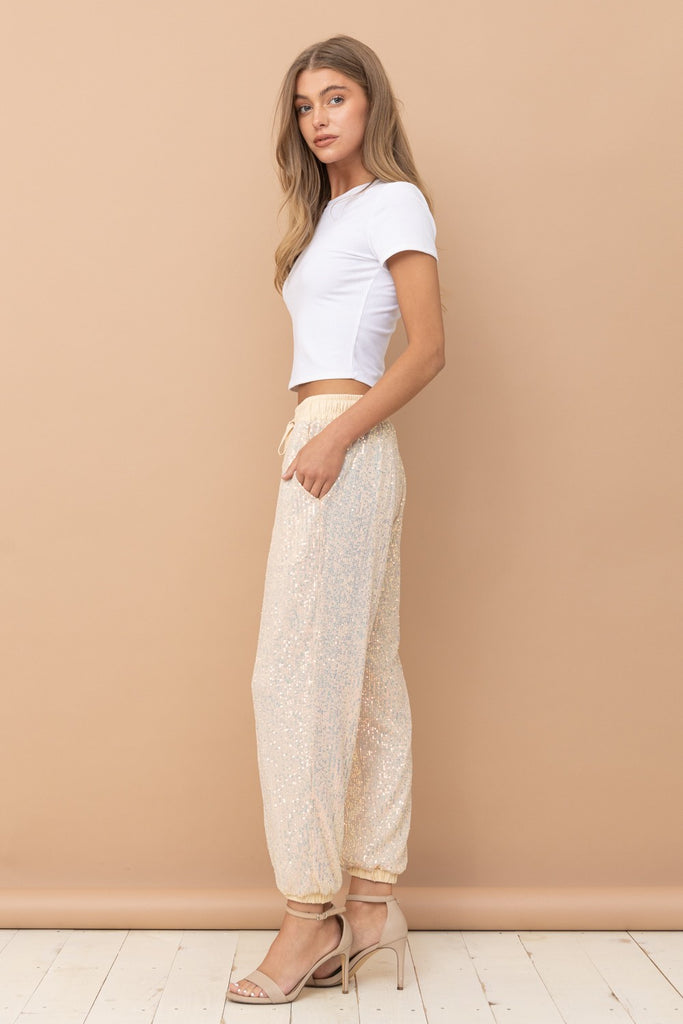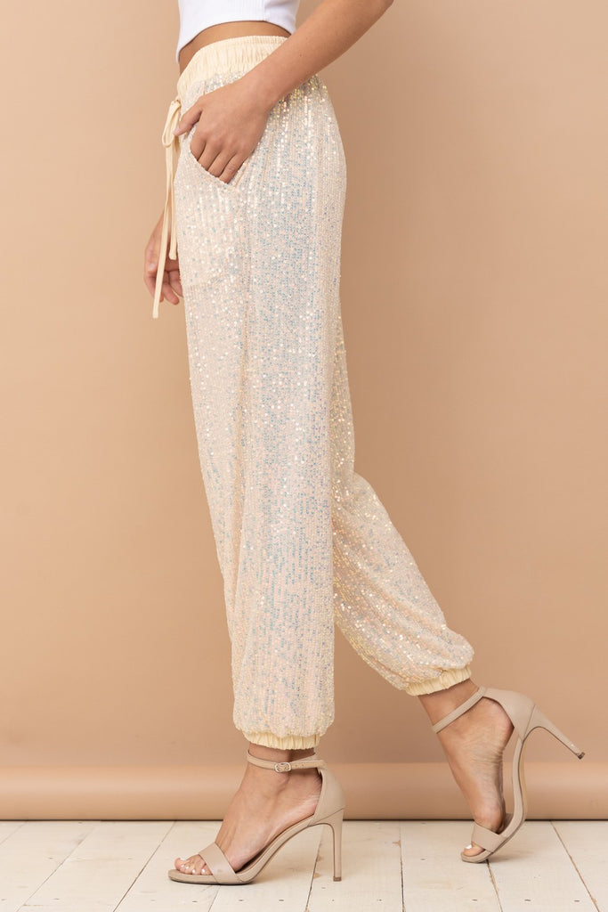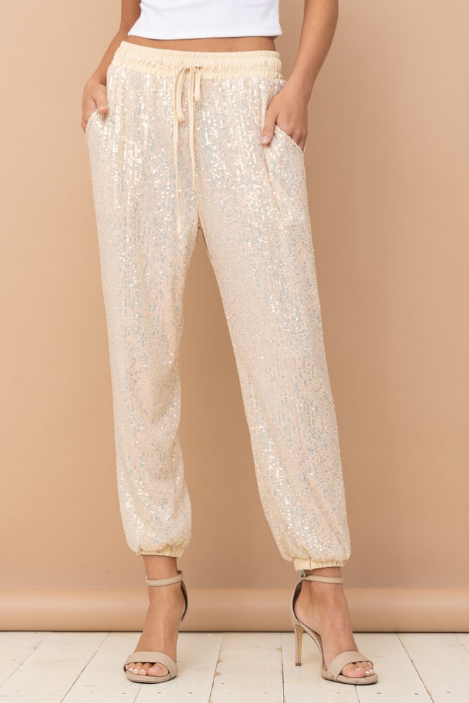 It has pockets! Sequin Jogger with true drawstring waist and fabric covered elastic at the ankles. These joggers are lined.