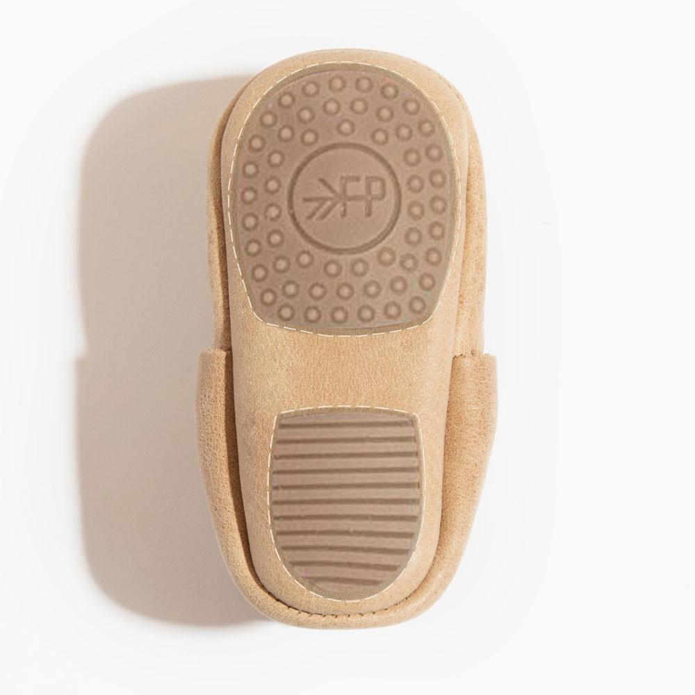 This sweet Mary Jane style is designed specifically for babies and toddlers with the same easy-on elastic opening and width as moccasins that keeps them secure on little feet. Made of our luxe Weathered Brown leather with a t-strap cut out, teardrop details, adorable scalloped collar, and complete with our new slip-free rubber soles.