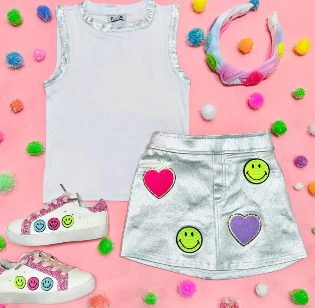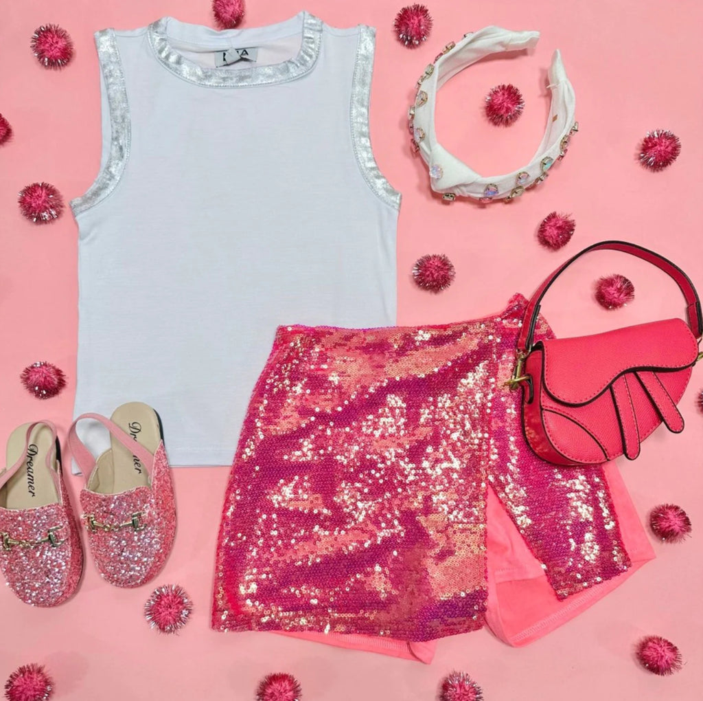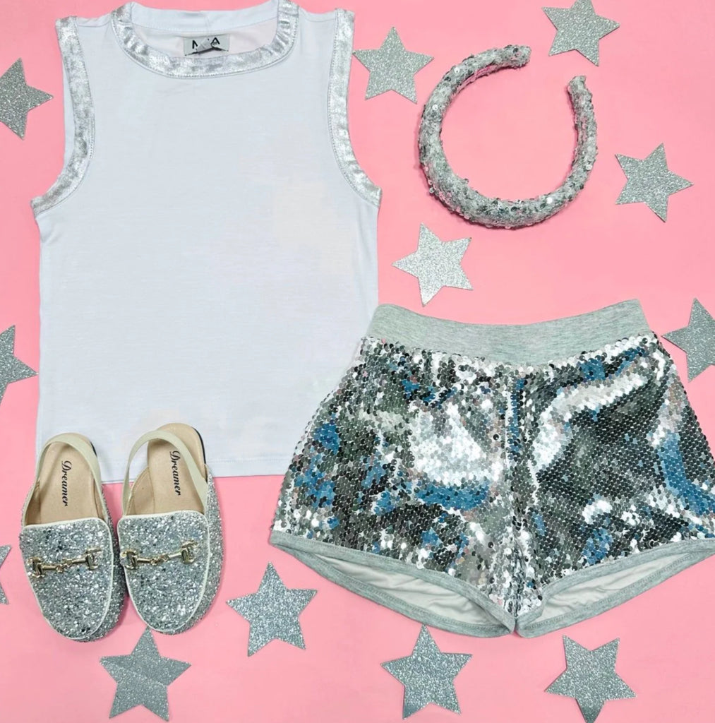 This Mia New York tank top is stylish, sweet, and simple. Perfect for taking any casual outfit to a cool new level, it comes complete with shimmery foil accents at the neckline and sleeves for a touch of added sparkle. Pair it with our Silver Sequin Shorts for an extra fun outfit!